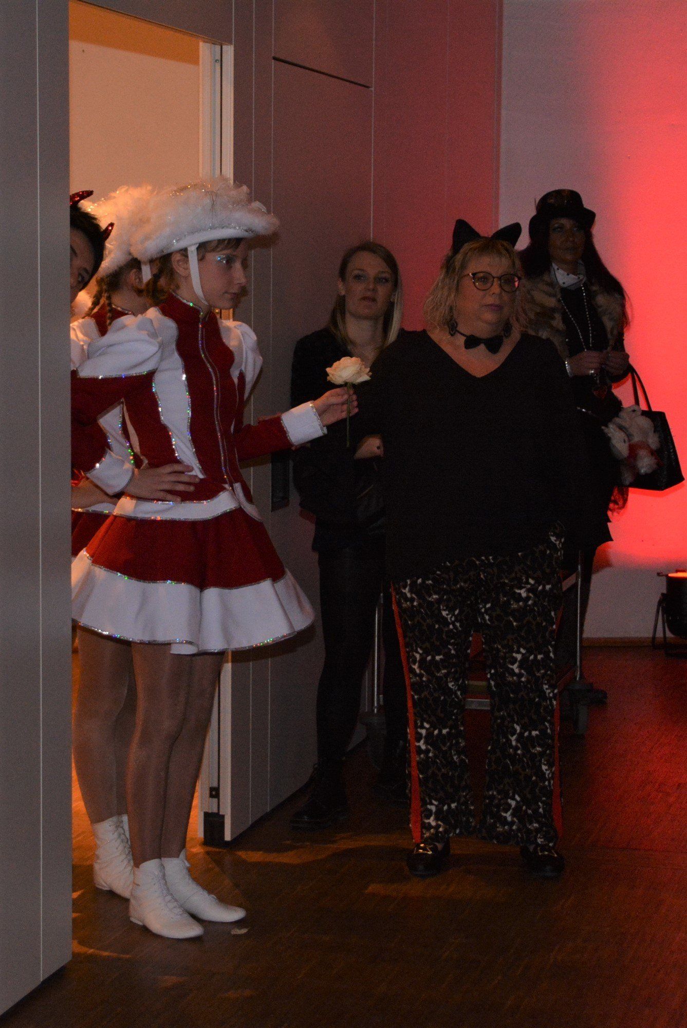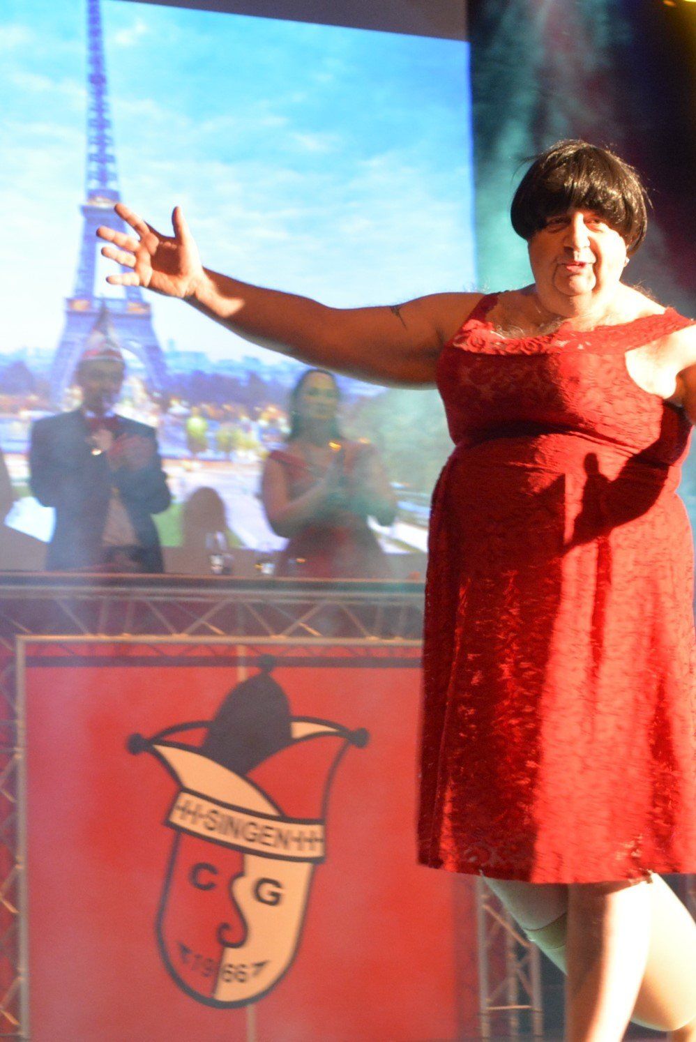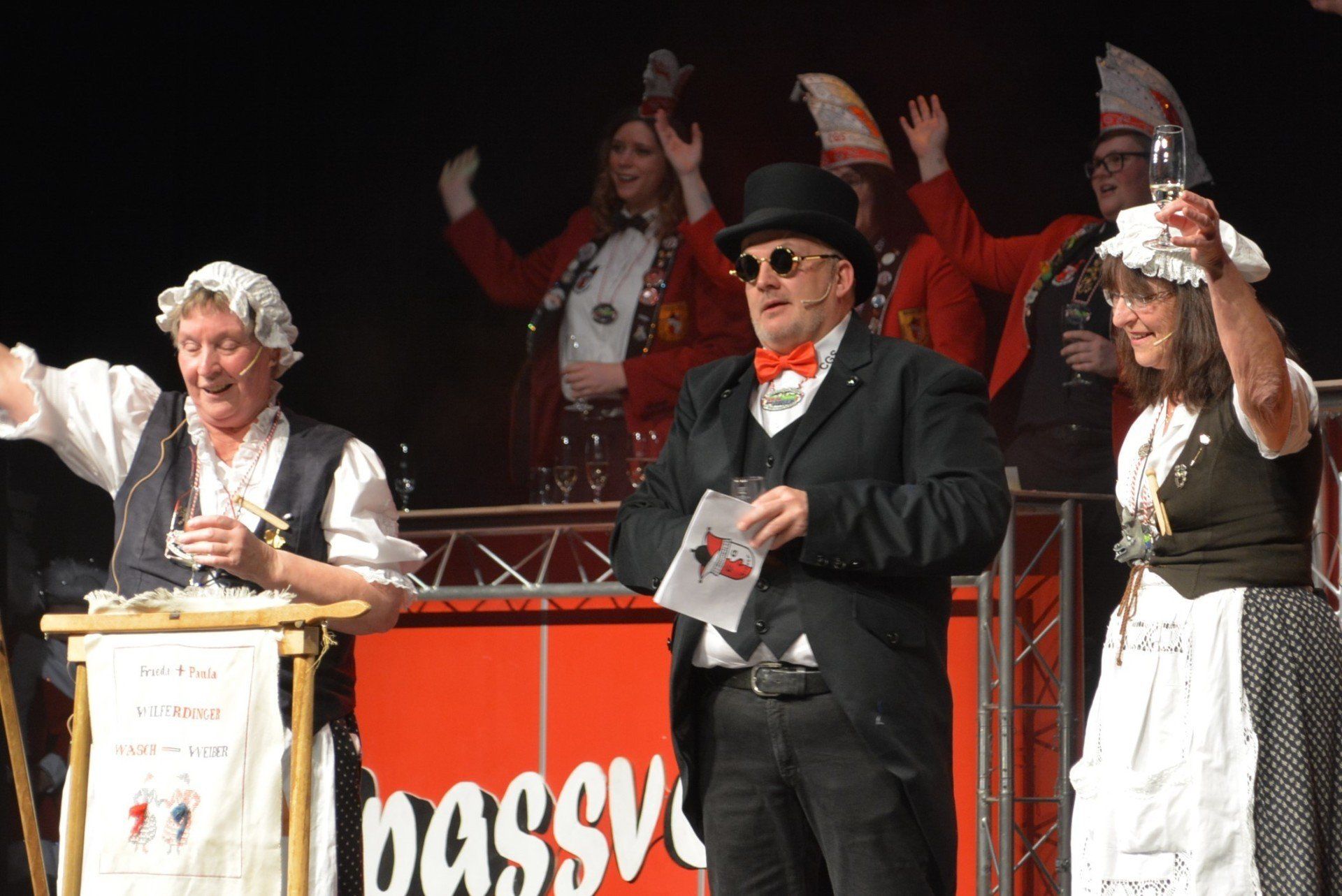 Ob Mann oder Frau, wer weiß es genau – aber auf alle Fälle mit jeder Menge Stimmung strapazierten die beiden Transvestit-Künstler Fanny und Marco vom Duo „Clapaeu Claque“ die Lachmuskeln des kreischenden Publikums. „Lange Rede, gar kein Sinn“, betitelten sie ihre heitere Mischung aus Schlagern und Spaß und witzelten mit Blick zum Elferrat um Faschingsprinz Alexandra II. (Di Sanjo) und Roman I. (Roth): „Die Muppet-Show sitzt hinter uns.“ Den Spo(t)t auf den als bunter Harlekin verkleideten Bürgermeister Luca Wilhelm Prayon lenkten derweil die Wilferdinger Waschweiber Helene Schwarz und Monika Foemer. Aber auch alle Vegetarier, deren Demos ja Gemüseaufläufe seien, die Bäcker, die mit Sechskornbroten und „Amerikanern auf Schnecken“ wahre Pornografie im Schaufenster präsentierten und überhaupt die ganzen Männer bekamen von den selbstbezeichneten „fleißigsten Goschen im Flecken“ ihr Fett weg: „Mir dede se jo en de Himmel hoch hebe, wenn ma wissde, sie bliebe drobbe!“