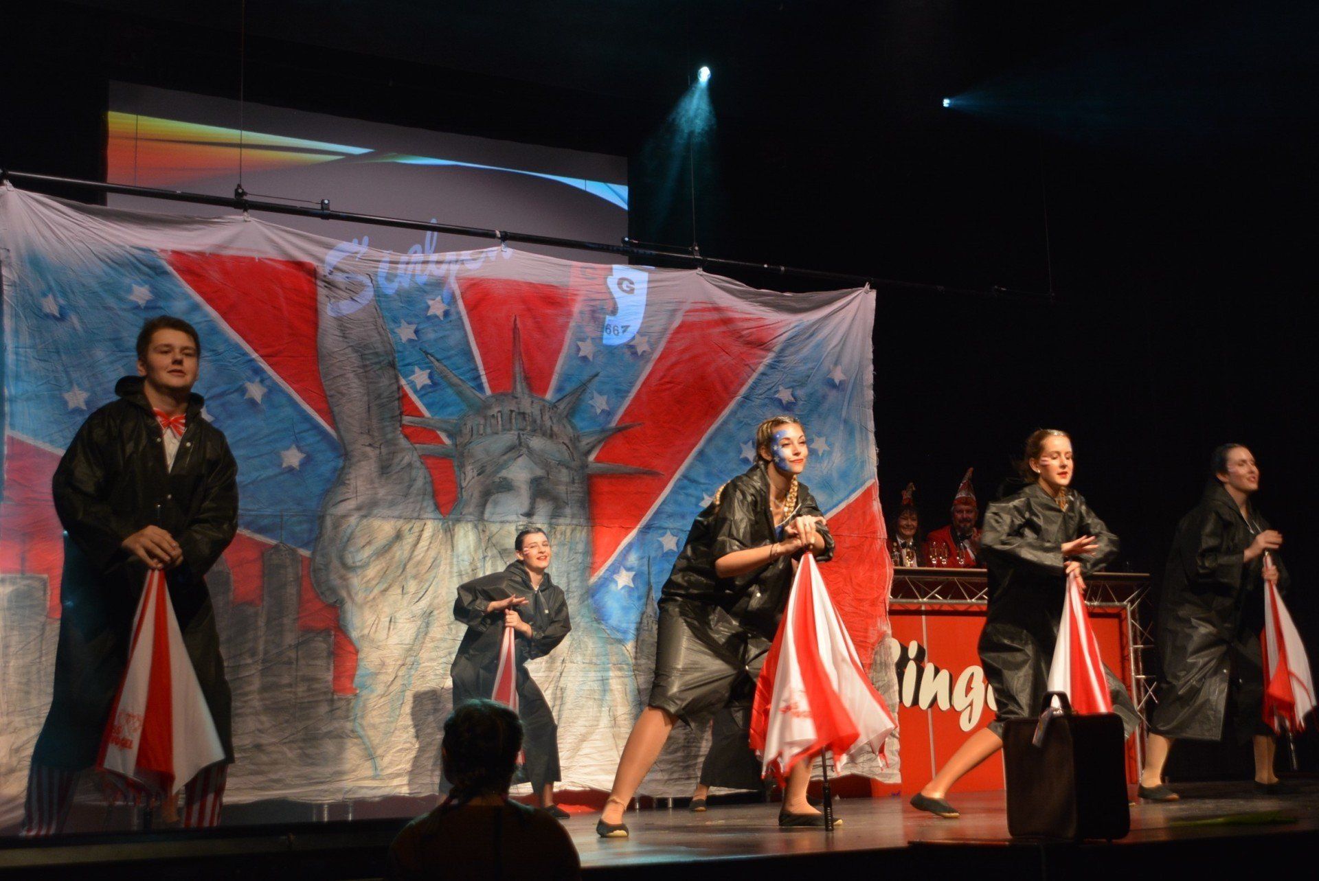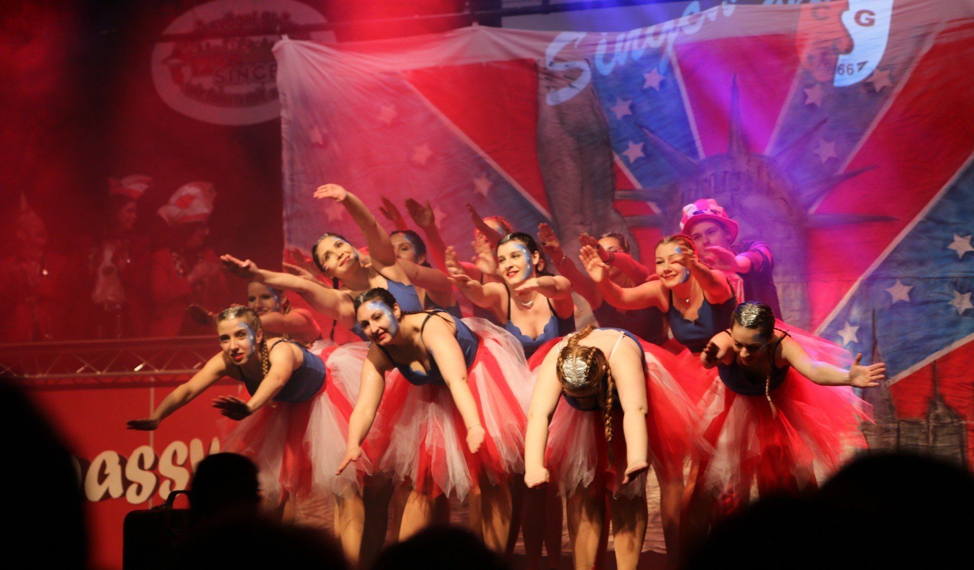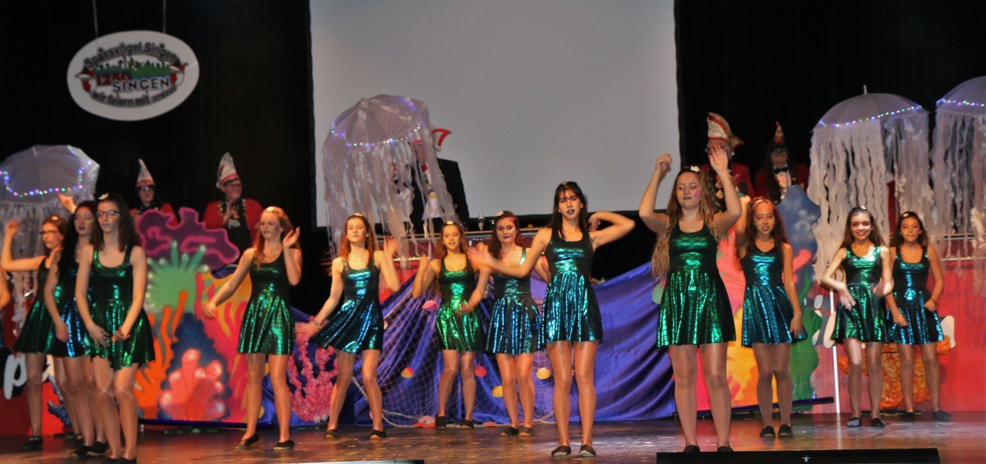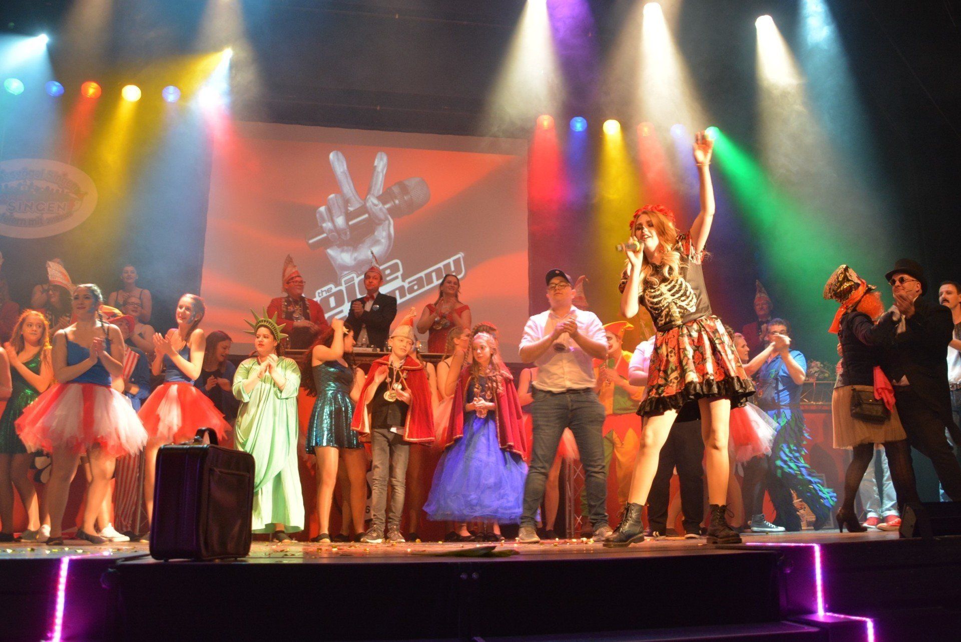 Immer wieder verzauberten die Vereinsgarden um das flinke Tanzpaar Hannah Lüdemann und Paula Bräuner sowie das ebenso äußerst gelenkige Tanzmariechen Mia Pizzino Jung und Alt – erst ganz klassisch im (neuen) Marschkostüm und dann mit eleganten Showtänzen vor aufwändiger Kulisse (trainiert von Michelle Sebastian, Ines Schönthaler, Lisa Folz, Marlén Hoffmann, Heike Schmidt, Nicola Gartner, Franziska Roth, Sara Müller und Michelle Schneeweiß,): Während die Juniorengarde mit Quallen und Krebsen unten im Meer um die Wette schwamm, reiste die Prinzengarde von Remchingen nach New York und gab damit den Auftakt zum großen Finale, das die ehemalige „Voice of Germany“-Kandidatin Laura Ritter stimmgewaltig und ausdrucksstark rockte, bis die Karnevalisten auf den Tischen tanzten.