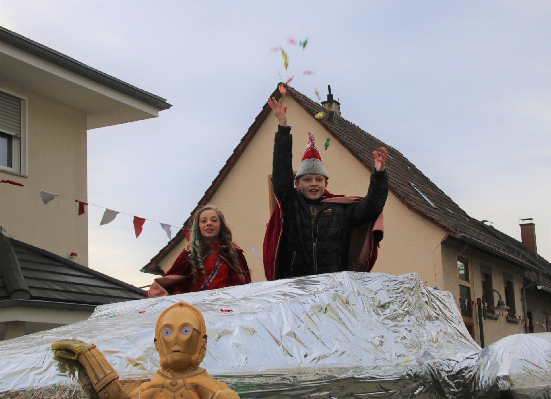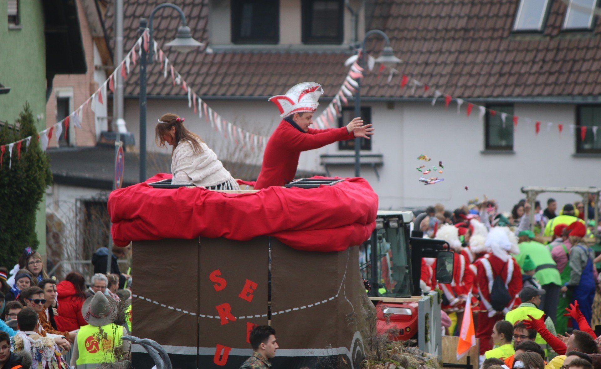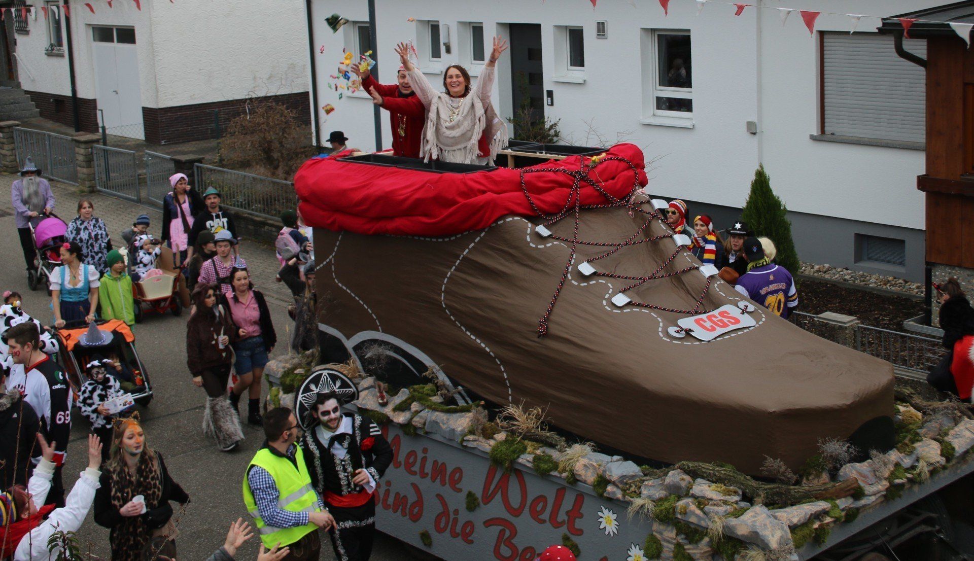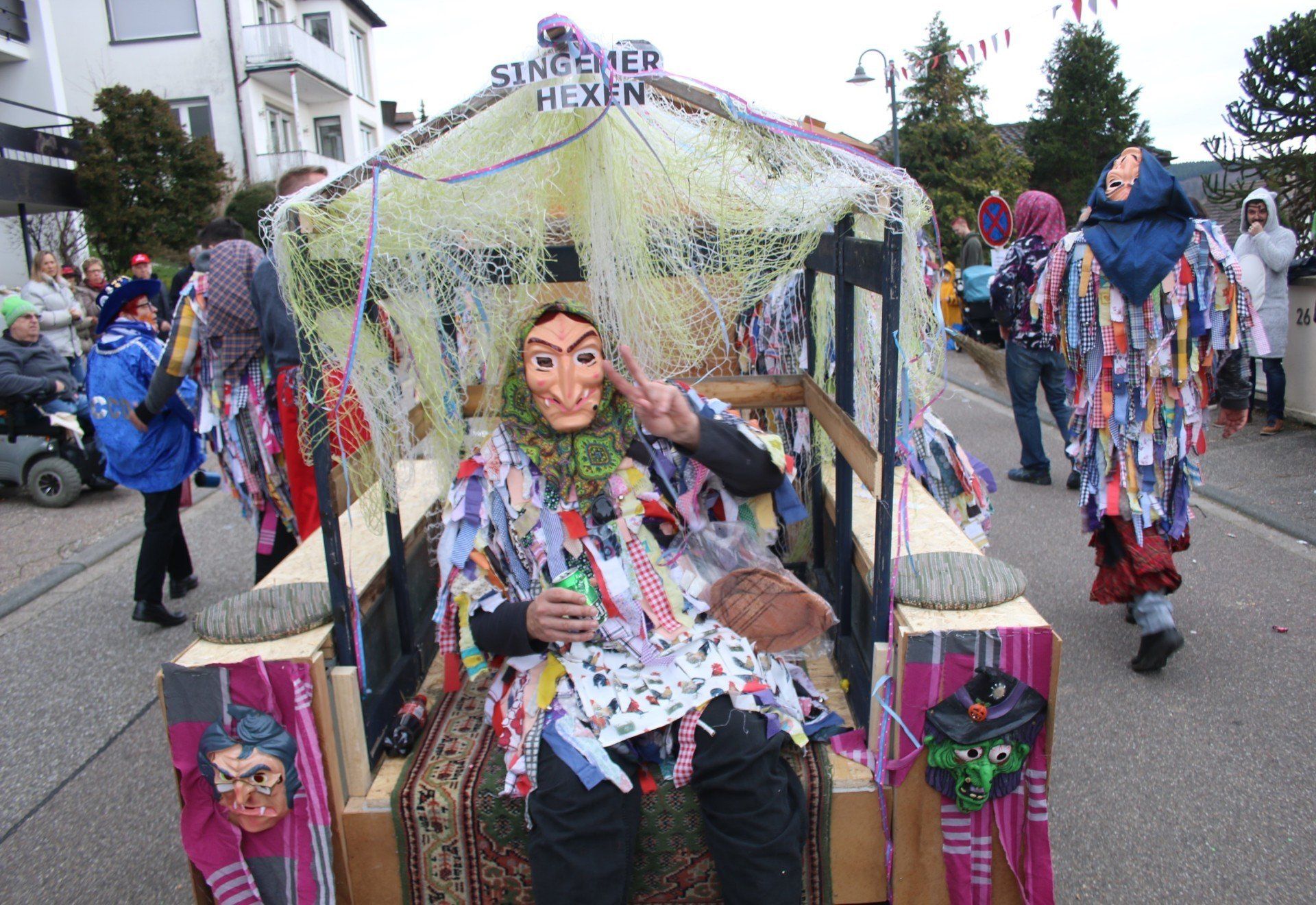 Mittendrin: Kinderprinzenpaar Anneke I. Roser und Phil I. Preiß im silbernen Weltraum-Düsenjet, während sich das Prinzenpaar Alexandra II. Di Sannio und Roman I. Roth im riesengroßen Wanderschuh vor uriger Bergkulisse kutschieren ließ und ebenso jede Menge Gutsele und Geschenke regnen ließ. Ob FCG-Fußballer als Bier(hoff)-Flaschen verkleidet, Gartenzwerge, Narren im Farbeimer und der Mönchkutte, Pfinztrolle, Keltereck-Esel, Singener Bären und natürlich schaurig-fröhliche Hexen, die vor so mancher Haustür kehrten: Der Spaßfaktor bei der ganzen Familie war garantiert in den vollgefüllten Straßen.