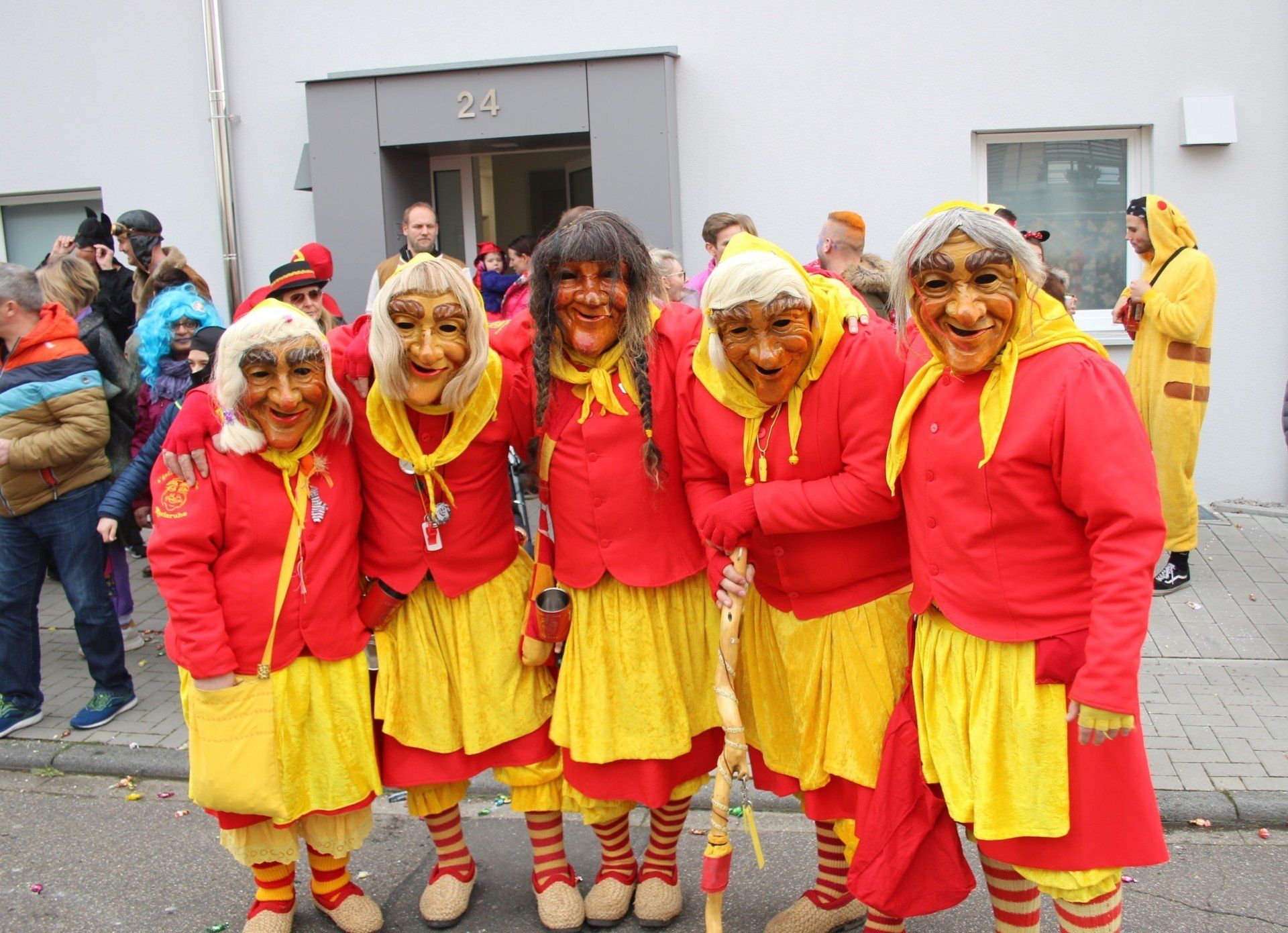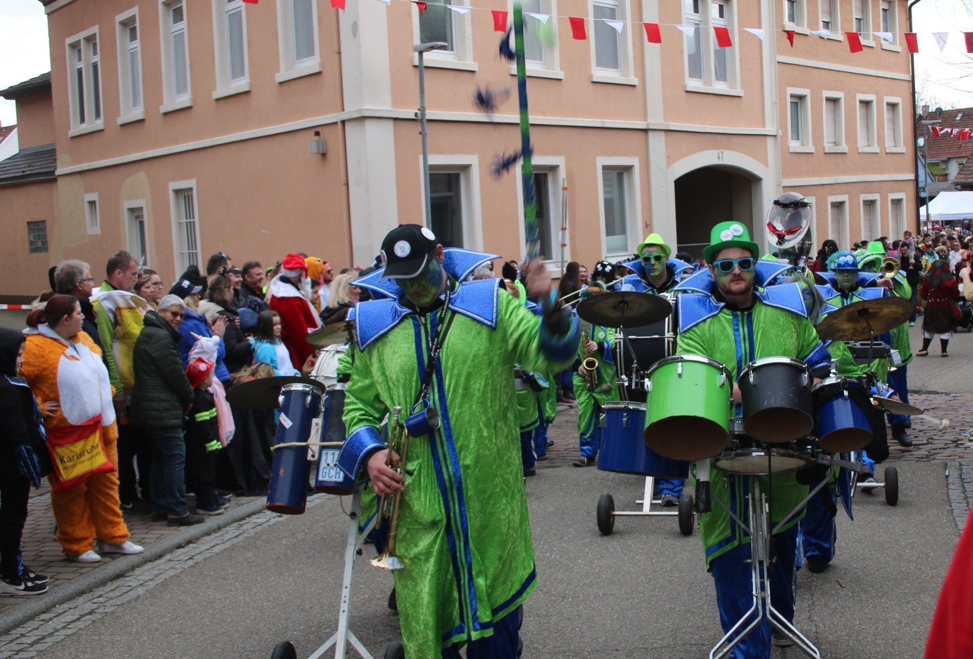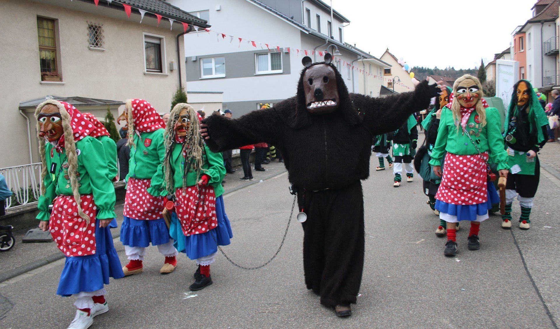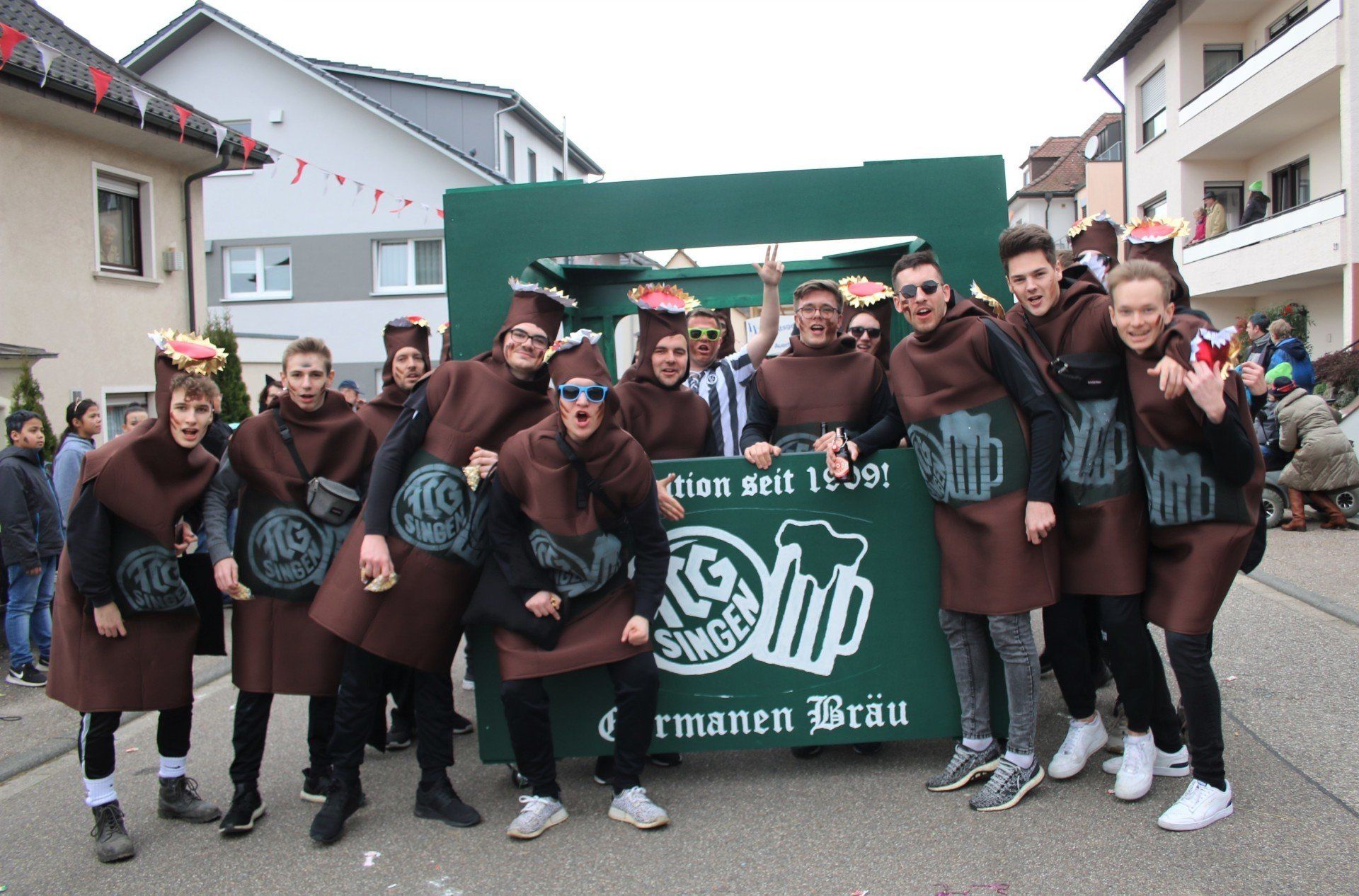 Mittendrin: Kinderprinzenpaar Anneke I. Roser und Phil I. Preiß im silbernen Weltraum-Düsenjet, während sich das Prinzenpaar Alexandra II. Di Sannio und Roman I. Roth im riesengroßen Wanderschuh vor uriger Bergkulisse kutschieren ließ und ebenso jede Menge Gutsele und Geschenke regnen ließ. Ob FCG-Fußballer als Bier(hoff)-Flaschen verkleidet, Gartenzwerge, Narren im Farbeimer und der Mönchkutte, Pfinztrolle, Keltereck-Esel, Singener Bären und natürlich schaurig-fröhliche Hexen, die vor so mancher Haustür kehrten: Der Spaßfaktor bei der ganzen Familie war garantiert in den vollgefüllten Straßen.